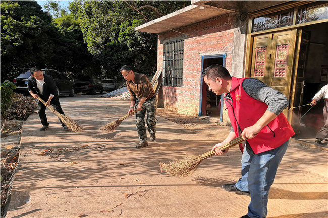 肖源副總裁(左一)與扶貧工作隊員清掃幫扶對象房前的垃圾。